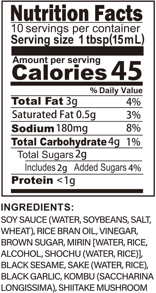 Ingredients: SOY SAUCE (WATER, SOYBEANS, SALT, WHEAT), RICE BRAN OIL, VINEGAR, BROWN SUGAR, MIRIN [WATER, RICE, ALCOHOL, SHOCHU (WATER, RICE)], SAKE (WATER, RICE), BROWN SUGAR, BLACK GARLIC, SHIITAKE MUSHROOM, KOMBU (SACCHARINA LONGISSIMA)