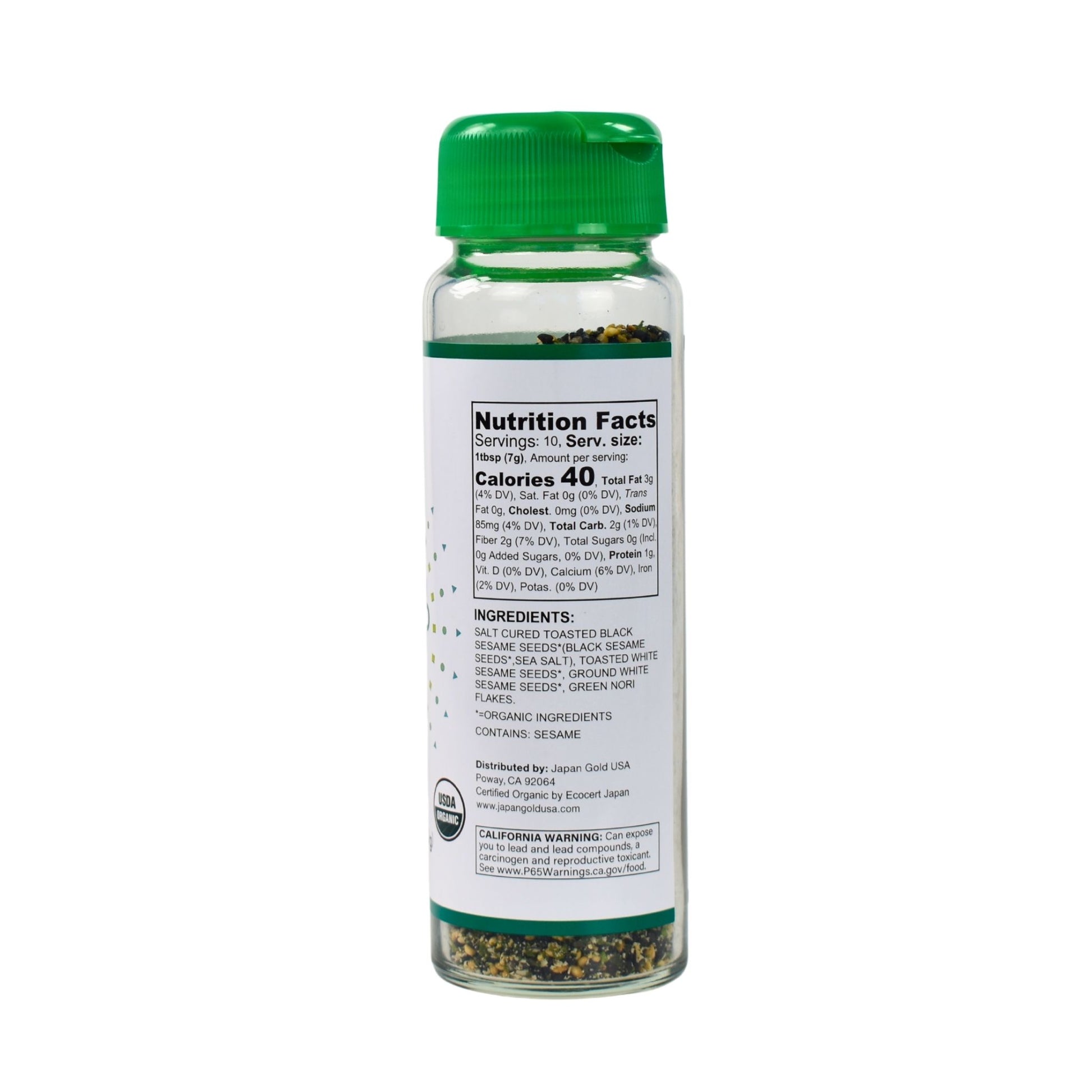 INGREDIENTS: Salt Cured Toasted Black Sesame Seeds (Black Sesame Seeds* and Sea Salt), Toasted White Sesame Seeds*, Ground White Sesame Seeds*, Green Nori Flakes.