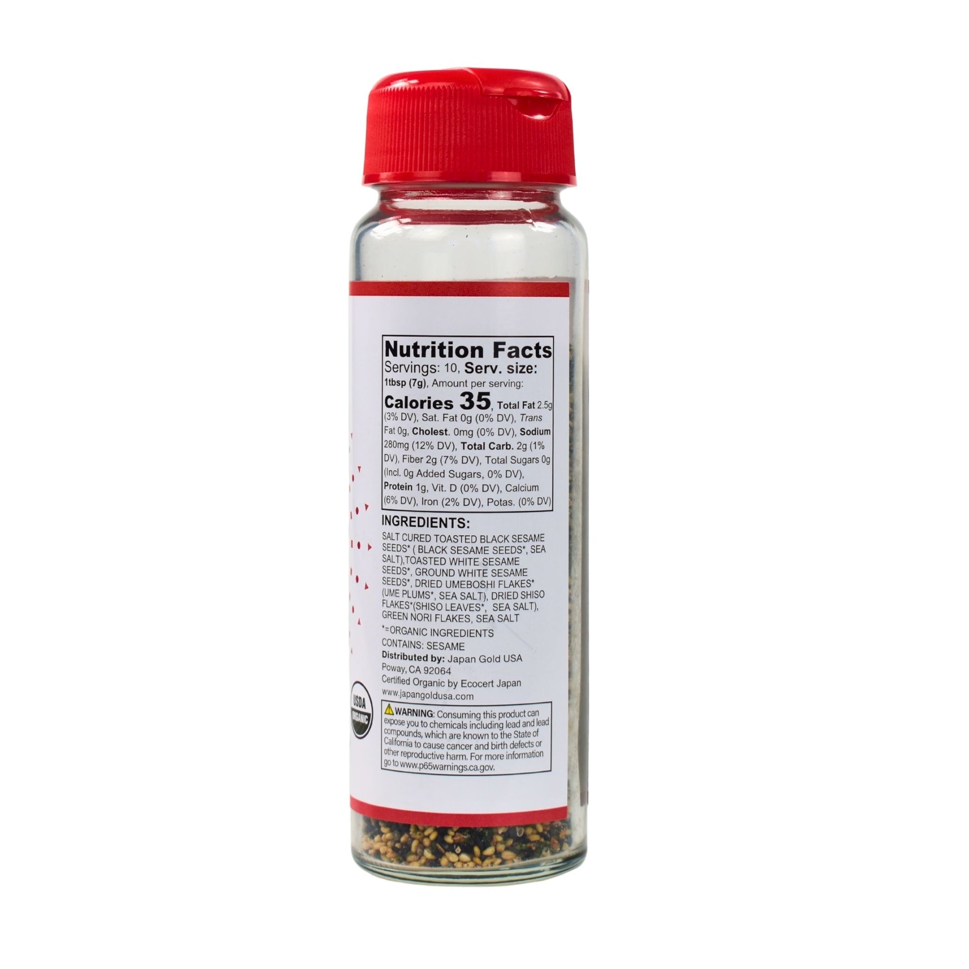 INGREDIENTS: Salt Cured Toasted Black Sesame Seeds*(Black Sesame Seeds* and Sea Salt), Toasted White Sesame Seeds*, Ground White Sesame Seeds*, Dried Umeboshi Flakes*(Ume Plums*, Shiso leaves*, and SeaSalt), Dried Shiso Flakes (Shiso Leaves* and Sea Salt), Green Nori Flakes, Sea Salt. *=ORGANIC INGREDIENTS